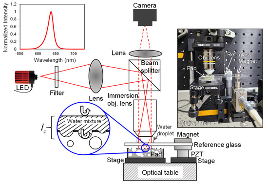However, the configuration of the interferometer used was similar to a Mirau interferometer, which has been used in recent years for the metrology of a patterned wafer [17], thin film [18], and micro electro mechanical systems (MEMS) [19]. Most Mirau interferometers commonly employ a commercial interferometry microscope objective involving a small reference mirror and a beam splitter in the body to generate an equal path length-induced interference for a sample in air. For submerged samples, such as a pad in slurry, however, this arrangement is not suitable for use because when the objective is immersed in the liquid, the sample and reference beam paths may not be identical due to refractive index mismatch between the surrounding media. Thus, interference is not ensured. Furthermore, a highly reflective metallic mirror in the objective may degrade signal contrast in the interference for the inspection of low reflectance materials. In contrast, the proposed interferometer has an individual immersion objective and a movable reference glass, which aides index matching and allows the reference glass to be properly positioned within the coherence length, ensuring high-contrast interference on the submerged materials.