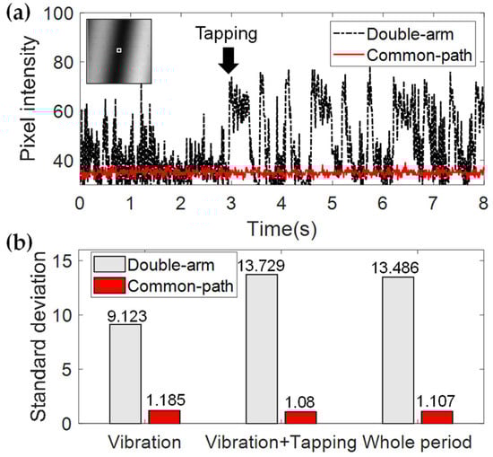 Interference signal stabilization using the proposed method. (a) Time-course interference signal intensities in the presence of surrounding noise (0–3 s vibration, 3–8 s vibration + tapping). Despite the external noise, the signal magnitude (red line) is stabilized by the proposed common-path interferometer (Video S2), whereas for the existing double-arm interferometer, the magnitude (dotted line) experiences considerable fluctuations (Video S1). (b) Comparison of the fluctuation in magnitudes with the corresponding standard deviations for each interval.