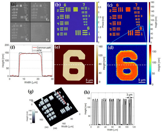 Next, to validate the system’s efficiency in mapping the fine surface profile in wet conditions, we imaged a positive 1951 USAF resolution test target (R3L3S1P, Thorlabs Inc., Newton, NJ, USA). The resolution target was chosen as a well-defined sample with nanoscopic roughness. A water droplet was inserted between the resolution target and the reference glass, and, similar to the processes depicted in Figure 2, the system was exposed to the surrounding vibration during the PSI process. Then, to capture a surface profile for use in reconstruction, the resolution target was also scanned using an atomic force microscope (AFM, XE-100, Park Systems), which is a standard metrology microscope used for high-precision surface mapping. Because the scan range of the AFM is limited to 40 × 40 μm, we selected an area (30 × 30 μm) with a nanoscopic pattern (group 6) printed in chrome on the target substrate prior to AFM imaging; thus, the AFM result was compared with our result from the same region. Figure 3 shows the results of surface imaging. The PSI created four phase-shifted interference images (Figure 3a), from which an unwrapped phase map was derived (Figure 3b). Using Figure 3b, therefore, the surface topology of the target was reconstructed (Figure 3c), and showed height profiles of the patterns on the target. For the pre-selected region, which resembled that depicted in Figure 3d, an enlarged view of the box in Figure 3c was also mapped using AFM, as shown in Figure 3e. Figure 3f presents a graph that displays height profiles taken along the dotted lines in Figure 3e,d, and shows that the height profile derived using the proposed method coincides with that derived using AFM, with the exception of subtle differences on either side of the plateau, for which the averages were 144.79 nm (proposed) and 145.35 nm (AFM). The measurement error to the reference value (145.35 nm) from five repeated measurements averaged 0.37 nm, which represents the measurement accuracy of our system. Moreover, the lateral resolution of the system was measured via a line profile (Figure 3h) taken along a dotted line on the height map (Figure 3g); this resolution was found to be approximately 3 μm from the smallest resolvable pattern (element 6 of group 7). This experiment confirms the capability of the proposed method to accurately capture fine surface profiles even in wet and noisy environments.