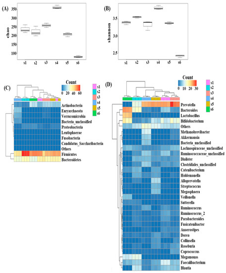 The 16S rRNA gene sequencing data were analyzed using the mothur pipeline [13]. Briefly, paired-reads were merged with make.contigs and reads shorter than 200 bp or longer than 400 bp were removed by screen.seqs before being aligned to the SILVA database [14] using align.seqs. Machinery sequencing errors were corrected using pre.cluster, chimeric sequences were detected using chimera.vserach, and taxonomic classification was performed using the RDP database [15]. α-diversity indices for species richness (Chao I) and species evenness (Shannon) were calculated using summary.single, and β-diversity was compared based on the Bray–Curtis distance [16], which was expressed using non-metric multidimensional scaling (NMDS). Intestinal metabolic activities were predicted using phylogenetic investigation of communities by reconstruction of unobserved states (PICRUSt2) [17].