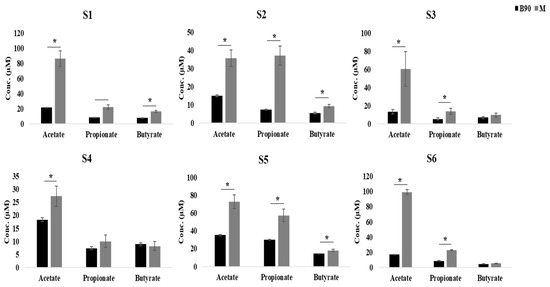 Quantitative comparison of SCFA production in each subject with and without digested beef treatment, as represented by grey and black bars, respectively (*; p < 0.05).