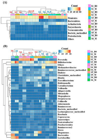 Fecal fermentation induced minor shifts in taxonomic composition at the phylum level. The results shown in Figure 3 show that digested beef powder increased the abundance of both the Firmicutes and Actinobacteria while decreasing the abundance of Bacteroidetes. At the genus level, we observed a decrease in Prevotella and an increase in Bifidobacterium among all subjects except for subject 6, who did not have any Prevotella at initiation. The genus-level composition comparison analysis showed varying degrees of abundance shifts in each subject.