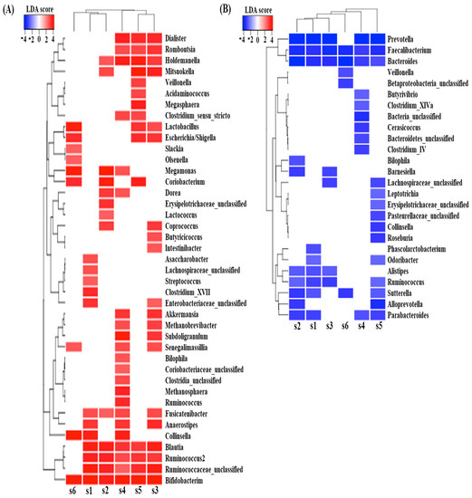 LefSe analysis predicted significantly increased genera (A) and decreased genera (B), following 90 min of fecal fermentation with digested beef.