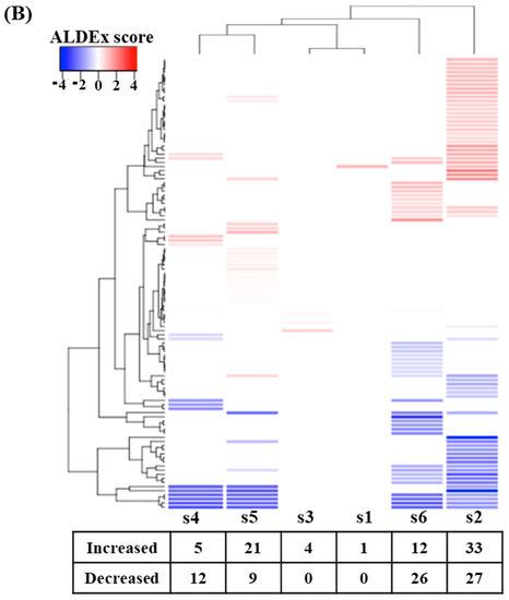 The results in Figure 5 show that digested beef treatment affected the predicted metabolic activity profiles to varying extents in each subject. Figure 5A shows that metabolic activity profiles were shifted in the same direction following fecal fermentation with digested beef powder. On the other hand, the number of metabolic activities demonstrating differential expression varied widely among subjects. Only one and four metabolic activities were affected for subject 1 and 3, respectively, while subjects 2 and 6 demonstrated nearly 50–60 implicated metabolic pathways.