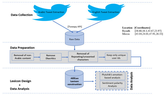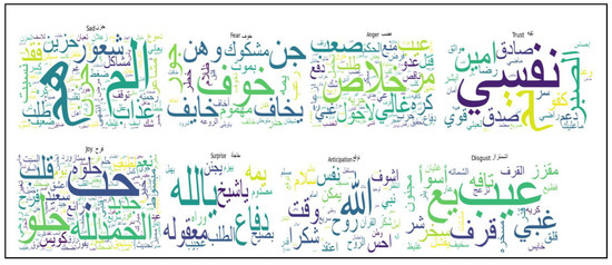 Apart from the words belonging to the eight mood categories, additional words were manually added under the category of positive and negative emotions. We developed our dictionary based on the Moodbook and NRC Word-Emotion Lexicon (Emolex). Both Emolex and Moodbook also tag words according to Plutchik’s eight emotions along with the two categories of semantic polarities—positive and negative. However, neither dictionary categorized the moods according to our context. Moreover, these dictionaries are based on words in the English language only. Therefore, we extended these dictionaries to the Arabic language, along with new words, to form our bilingual dictionary, “AEELex”. This dictionary was developed using more than 19,000 tweets written in the Arabic language.