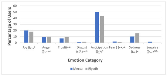 Joy, but a higher proportion of the users in Mecca, approximately 20%, expressed the emotion