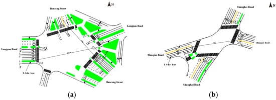 A diagram of the intersection: (a) the intersection at Longpan Road and Bancang Street; (b) the intersection at Shanghai Road and Huaqiao Road.