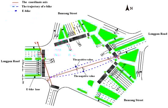 Next, the video is imported into the Tracker and the coordinate system is set. The X-axis is the middle line of the e-bike from the stop line to the exit road. The Y-axis is perpendicular to the X-axis. The origin is the position of the stop point. Therefore, the change in position parallel to the X-axis represents the straight-line travel distance of the e-bike from the stop line to the exit road. The change of position parallel to the Y-axis represents the distance of the e-bike from the center of the road (expansion). The tracker software is used to collect the position coordinate information of each e-bike at every moment (1 s) during the green light release period. A total of 2386 e-bike tracks are collected. Taking the intersection of Longpan Road and Bancang Street as an example, the coordinate system is shown in Figure 2.