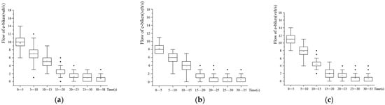 The flow of e-bikes gradually decreases with an increase in time during the seven time intervals of the green light release period. After 15 s, the flow tends to be stable in the time interval. The flow data remained between 2 and 4 veh/s. The flow data of 0–5 s and 5–10 s are distributed at a higher position than those of other time intervals. Its median value is around 10 veh/s and can reach as high as 14 veh/s. According to the statistics, the flow and the total flow of the three inlet channels in the time period of 0–15 s are more than 70% of all the flow. It can be seen that the discharge of e-bikes during the green light period is mainly concentrated in the first 15 s.