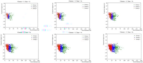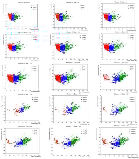 The K-means clustering method is used to further analyze the spacing variation of straight-going e-bikes during the green light release period. The position of the e-bike is drawn in the coordinate system at a time interval of 1 s. The establishment standard of the coordinate system can be seen in Figure 2. Each dot represents an e-bike. The clustering coefficients are k = 2, 3, and 4. The change of the spacing of the e-bikes in different clusters at each moment was analyzed, and the stage of straight-going e-bike was the most obvious when k = 3. Therefore, straight-going e-bikes are divided into three subgroups to determine the release group with the most obvious expansion degree. We take the spacing change of the green light release period of the northwest entrance road at the intersection of Longpan Road and Bancang Street as an example, as shown in Figure 4.