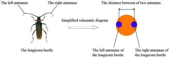 The beetle antennae search (BAS) algorithm was first proposed in 2017 []. It is a new algorithm for multi-objective function optimization based on the longicorn foraging principle, and it can be used to optimize the weight and threshold of a BP neural network to realize the automatic optimization process []. Compared with the traditional back propagation (BP) neural network, the BAS-BP neural network optimizes weights and thresholds in the input layer, output layer, and hidden layer structure, which overcomes the problems of poor stability and easily falls into the local optimum of the BP neural network []. The diagram of the longicorn beetle and the optimization structure of the BAS-BP neural network were shown in Figure 5 and Figure 6, respectively. The main steps of the algorithm are as follows: