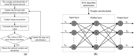 Schematic diagram of the optimization structure of the BAS-BP neural network: (a) BAS algorithm optimization; (b) neural network structure.