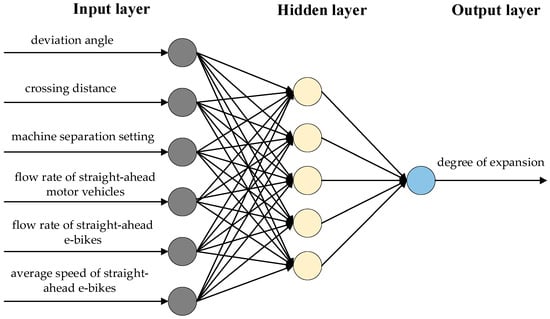 On the basis of the influence of dynamic and static factors on the expansion degree of e-bikes, we select six indexes as input variables: the deviation angle of irregular signalized intersection, crossing distance, machine separation setting, flow rate of straight-ahead motor vehicles, flow rate of straight-ahead e-bikes, and average speed. Machine non-separation is set as dummy variable, 0 represents inorganic non-separation, 1 represents green belt separation, and 2 represents fence separation. Expansion is taken as the output variable.