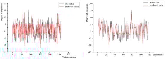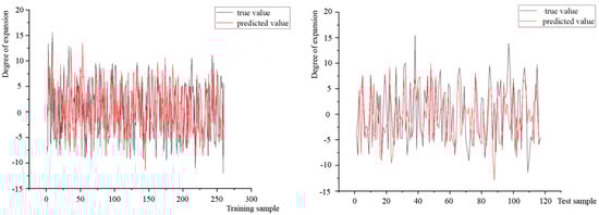 In order to ensure the validity of the model, 377 sets of data are divided into training sets and test sets according to the ratio 7:3 by the set aside method. The code for the BP neural network and the BAS-BP neural network is written and operates by Matlab (version R2014a). The results of 10 repeated runs are used to improve the prediction accuracy. The fitting results of the training and test sets of the BP neural network model and the BAS-BP neural network model are shown in Figure 8 and Figure 9, respectively.