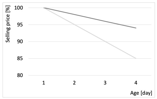 In order to address the problem under different realistic scenarios, we have generated 10 instances per company. In particular, we have generated the following data, by using a normal distribution with coefficient of variation equal to 0.10: , , , . The mean of the amount of weekly ripe product has been set to 60,000 kg and 22,000 kg, respectively, for and . The mean of the daily demand from each DC has been set to 1600 kg and 600 kg, respectively, for the two suppliers, while about spot customers it has been set to 800 kg and 500 kg. The unit selling prices of the fresh product to the main customer has been estimated, from the historical data made available by the official website of the Italian Institute of Services for the Agricultural Food Market [43]. has been estimated assuming a 10% increase in the price to the main customer. The perishable nature of the agricultural products of the case study has been taken into consideration assuming a dependence of the market price on the age of the product, as shown in Figure 1. The two lines represent in what percentage the market value of the product decreases with increasing age: in the case of broccoli (i.e., light gray line), a decrease of 5% per day has been considered, while this value is 2% per day if we refer to artichokes (i.e., dark gray line).