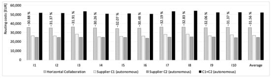 Routing costs [EUR] in the cases of autonomous and collaborative distribution.