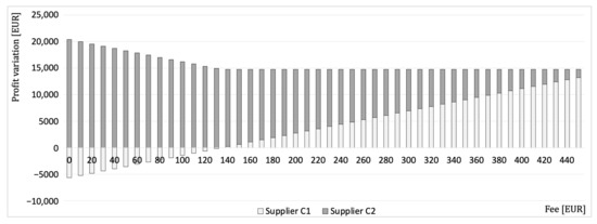 Average profit variation for the two suppliers, by varying the fee.