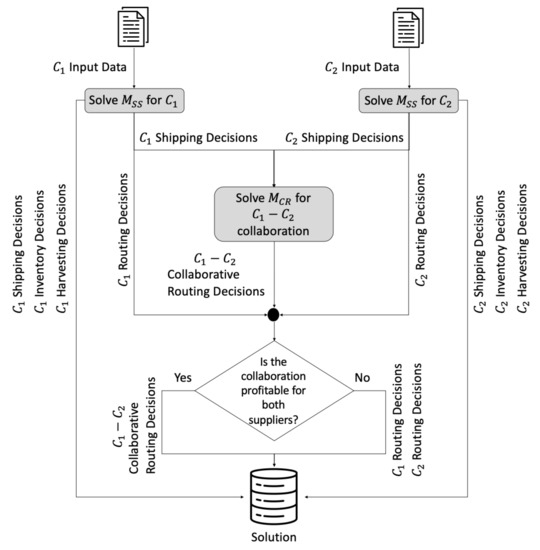 At the third step, the profitability of the collaboration for both suppliers is checked. If yes, the routing decisions resulting from the model are inserted into the solution. Otherwise, the collaboration is not implemented and autonomous routing decisions, output of the respective models , are inserted into the overall solution.