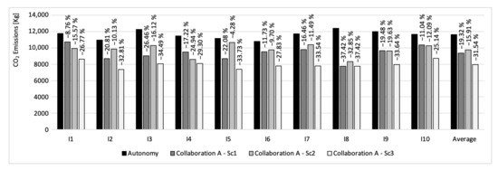 Comparison in terms of CO emissions reduction between autonomous and collaborative distribution.