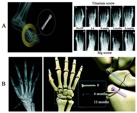 - Biber, R.; Pauser, J.; Geßlein, M.; Bail, H.J. Magnesium-Based Absorbable Metal Screws for Intra-Articular Fracture Fixation. Case Rep. Orthop. 2016, 2016, 9673174. [Google Scholar] [CrossRef]