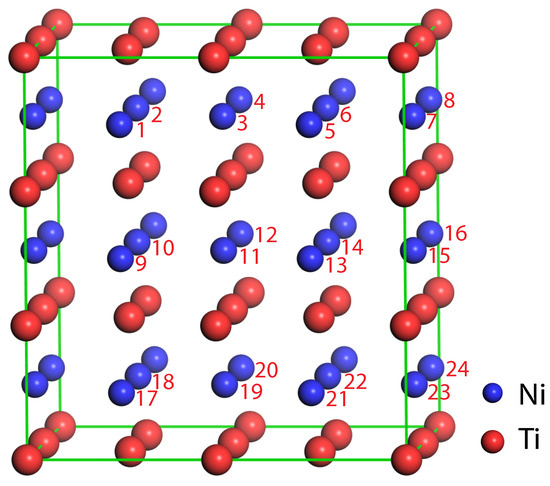 NiTi B2, orthorhombic B19, and monoclinic B19 structures taken from our previous work [47] are adopted in the present study. Note that we employ the parent NiTi body-centered tetragonal (bct) lattice. The structural parameters of bct are , , here is the lattice constants of cubic B2 NiTi structure. In addition, we focus on the B19 and B19 structures for the martensite phase reported in the literature [3,5,48]. The structures and parameters of B19 and B19 are very close to each other, except the monoclinic distortion from 90 to = 98.26. Considering the symmetry of the cell, 3 × 2 × 2 supercells of the B2, B19, and B19 are constructed containing 48 atoms for the present simulation.
