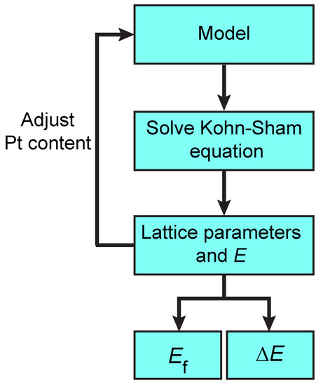 A schematic diagram of our study is presented in Figure 2. We first construct the computational models, then solve the Kohn–Sham equations, obtain the lattice parameters, and the total energies as a function of the doping concentration. We evaluate the phase stabilities of TiNiPt alloys via calculating the formation energies . At last, we describe the martensitic transformation through the energy differences between austenite and martensite phases in TiNiPt alloys.