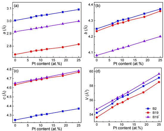 Substituting Ni with Pt, the number of valence electrons per atom of TiNiPt alloys remains a constant 7. Thus, the supercell volume mainly depends on the size of the constituent atoms. The atomic radii of Ni, Ti, and Pt are 1.25 Å, 1.45 Å, and 1.36 Å, respectively. The lattice parameters a, b, c and the lattice volumes of the NiTiPt alloys expand consistently with increasing Pt content in B2, B19, and B19 structures (see Figure 3). This can be attributed to the larger atomic size of Pt than of Ni atoms.