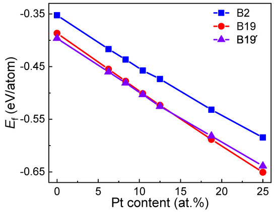 In Figure 4, we plot the calculated as a function of the Pt concentration. The binary NiTi alloy can be considered as a TiNiPt alloy containing zero at.% Pt. Above all, as can be seen from Figure 4, in equiatomic NiTi binary alloys, the B2 phase, which is only stable at high temperatures, exhibits the highest value of ; the B19 martensitic structure with the lowest formation energy is the most stable one. They are in excellent agreement with the previous experimental observations [67] and computational results [48].