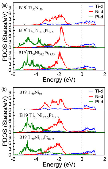 In order to investigate the electronic mechanism behind the martensitic transformation pathways, the partial density of states (PDOSs) of the B19 and B19 structures of TiNiPt alloys are calculated and plotted in Figure 5. For NiTi, the electronic states below the Fermi level are mostly contributed by the Ni d states, while electronic states above the Fermi level come mainly from Ti d states. This feature is consistent with other DFT study [46]. Furthermore, the hybridization between Ti d and Ni d states in the structure of B19 is stronger than that of B19. Moreover, compared with the Ti d of B19 NiTi, the high energy peaks above Fermi level of B19 shift towards the Fermi level. This suggests that B19 is more stable than B19 in NiTi, in accordance with the results of (see Figure 4).