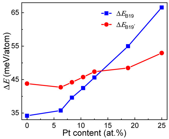 As the calculated results of formation energies presented, for Pt > 15 at.%, the monoclinic B19 martensite crystal structure becomes unstable and an orthorhombic B19 crystal structure is formed, resulting from a gradual destabilization/stabilization of B19/B19, which is in excellent agreement with the experimental data.