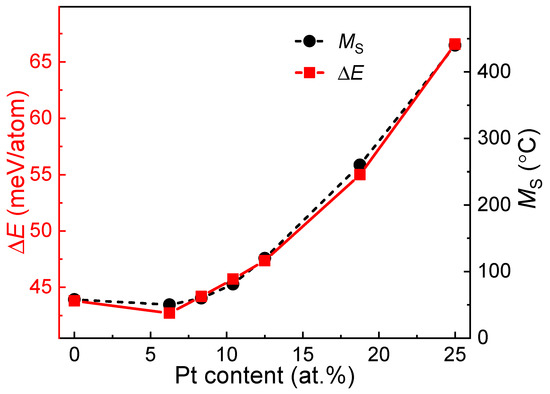 The computational results of the total energy differences between parent and martensite phases are as follows: for Pt < 10 at.%, the substitution of Pt for Ni has relatively little effect on (with a minimum at 6.25 at.% Pt), which shows only a moderate dependence of on alloy composition; for Pt ≥ 10 at.%, the increase linearly with increasing Pt content, which brings about the dramatical enhancement of .