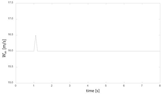 Following a limited set of preliminary experiments reported in Jalal et al. [], we conducted an extensive series of experiments on the aero-elasto-inertial response of wind turbine rotors by using Delft University’s stall-control rotor (see Jaimes []), an alternative to the NREL-5MW-RWT benchmark turbine. The DU-5MW stall RWT has a nominal wind speed of 15.3 m/s and a nominal rotational speed of 10.7 rpm. By studying the time evolution of the rotor’s oscillatory behavior when stimulated by pulses in the wind of controlled amplitude and time span (see Figure 1), we gained a deeper understanding of the underlying physics. We also obtained a reduced-order characterization of the rotor as an oscillatory system based on the principle of energy transfer between the kinetic energy of the wind-speed pulse and the elasto-inertial energy accumulated in the rotor. These wind pulses are mounted on top of a uniform stream inflow of different constant speeds covering the entire operational regime of the turbine from 5 to 25 m/s. The resultant study provides extremely valuable information to the wind power control community in order to produce Reduced-Order Models (ROMs) that could be solved in real time to develop predictive control strategies.