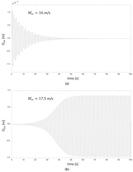 In the unstable regime, becomes negative (that is, the attenuation of the aerodynamic damping becomes an amplification of the oscillatory amplitude), producing an initial exponential expansion that will be studied in detail in Section 5.1. The initial expansion continues until the axial displacement reaches a certain level. From then on, a second damping mechanism emerges that competes with the existing amplification associated with the first mechanism. This evolution then starts to depart from the exponential behavior until the amount of energy extracted from the flow by the first mechanism is equivalent to that dissipated by the second. At that point, the oscillation levels out at a fixed amplitude. This effect shall be discussed in Section 5.2.