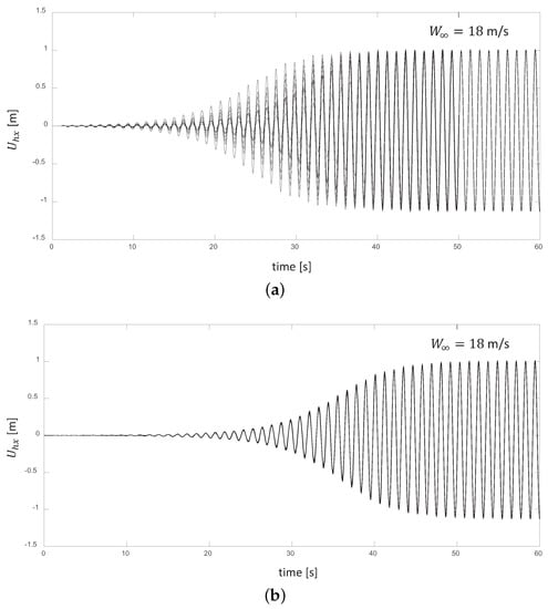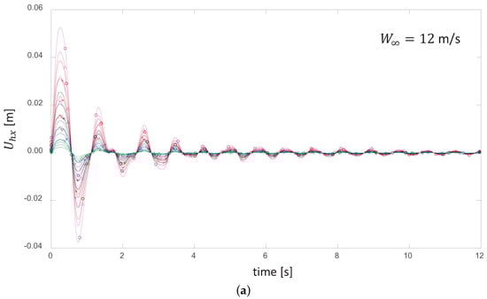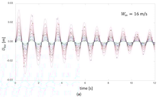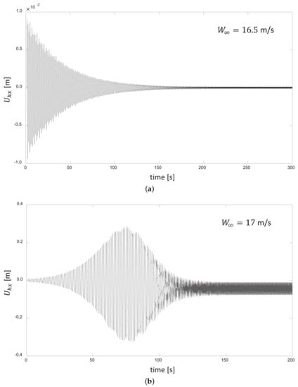 For wind speeds between 5–16.5 m/s, we found that the dynamic oscillatory response of the rotor remains stable. The kinetic energy of the wind pulse initiates oscillations, and those oscillations become damped by the system, creating a decay in the oscillatory signal (which is observable in the time evolution of the axial component of the blade deflection depicted in Figure 2 and Figure 3). Here, represents the instantaneous axial deflection of the blade about its equilibrium value corresponding to the deformation state induced by a certain constant .