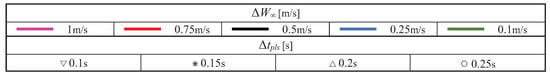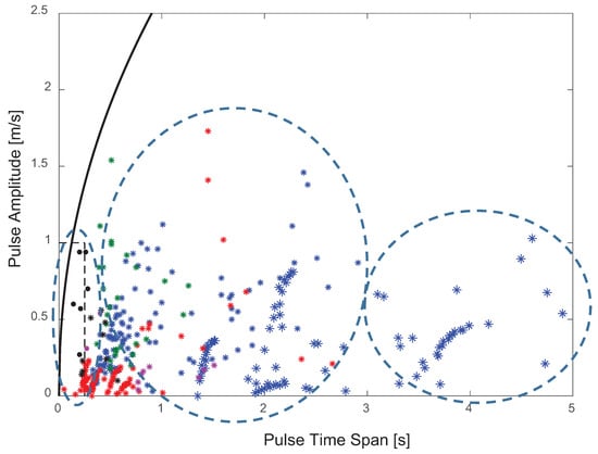 The axial displacement of the blade (depicted in Figure 5a for a wind-speed regime of 8 m/s) reflects the main component of the instantaneous amount of elastic energy stored in the rotor as an oscillatory system. We used it as an observable to construct a reduced-order characterization of the complex nonlinear oscillatory behaviors in terms of only one degree of freedom. We conducted this experiment for a wide variation of pulses in the short-duration zone, as in the classification chart shown in Figure 4, by combining different values of pulse amplitude and pulse time span. Figure 6 shows the code of the colors and markers used to identify the results for the pulses that combined different values of amplitude and time span.