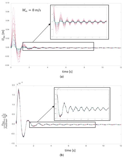 From the findings about the energy-transfer mechanism in the previous section, we have that, when normalized by the kinetic energy of the pulse, the blade displacement curves collapse into a unique signal, which scales with the time evolution of the rotor’s elastic vibrational energy. This has the units of flexibility or the inverse of stiffness , which depends exclusively on the mean value of the wind speed. Hence, for all of the pulses occurring at the same wind speed, we have: