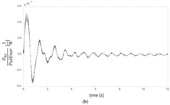 When normalized by the kinetic energy content of the pulses, as shown in Figure 5b, all of the displacement curves collapse into a unique signal, which scales as the time evolution of the rotor’s elastic vibrational energy. This has the units of an equivalent flexibility, N, or the inverse of a stiffness .