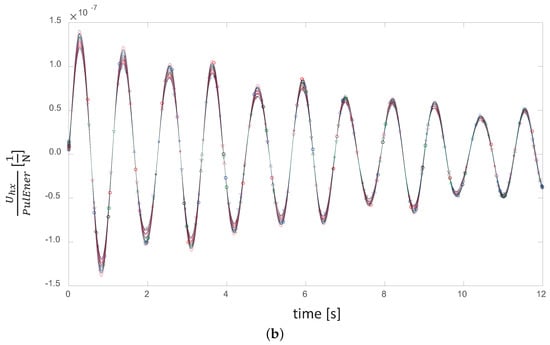We repeated the same experiment for several wind speed conditions that covered the entire stable regime and found the same systematic behavior. For example, Figure 7 shows the results of the kinetic energy normalization for a wind speed of 12 m/s, and Figure 8 shows the results for a wind speed of 16 m/s. The value of the equivalent stiffness mentioned above, , which serves as a scaling factor for the rotor’s elastic vibrational energy, depends exclusively on the mean wind speed. This is consistent with the average deflection of the blades around which the oscillations occur. The higher the mean wind speed is, the higher the value of this “pre-stiffening” will be.