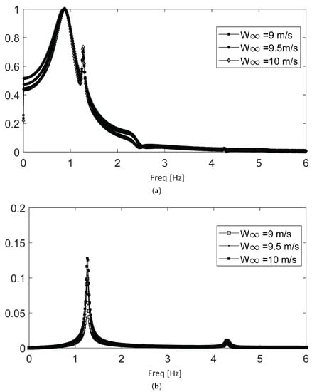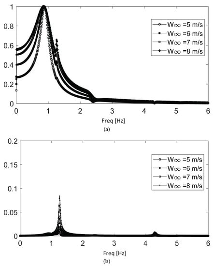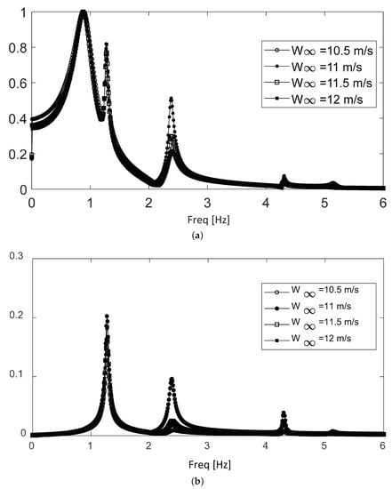 Figure 9 shows the spectra for the first subrange, which extends from 5 to 8 m/s, where only the first two frequencies (0.87 and 1.2 Hz) are dominant. The upper panel shows the frequency content along the time evolution (i.e., until oscillations are totally dissipated), where the 0.87 Hz frequency dominates, with a relatively small contribution of the 1.2 Hz frequency. The lower panel shows the spectrum for the long-term part of the same time signals. The 0.87 Hz frequency rapidly decays, while the 1.2 Hz component—even though it is smaller in the beginning—persists longer. In the long term, there is also a minimal contribution of the non-dominant 4.2 Hz frequency.