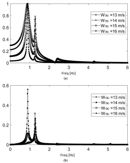 Figure 12 shows the spectra for the fourth and last subrange, which extends from 13 to 16 m/s, where the contribution is again mostly centered around the 0.87 Hz frequency, with a stronger presence of the 1.2 Hz component. An important distinctive feature is the presence of the 0.87 Hz frequency in the long-term spectra, which indicates a longer persistence (thus, a lower exponential decay) for this component. This ever-lower exponential decay of the 0.87 Hz component leads to the end of the stable regime, where the exponential decay approaches zero and then becomes negative. Thus, the aerodynamic damping turns into exponential expansion. In this subrange, the contributions of the other three frequencies become minimal.