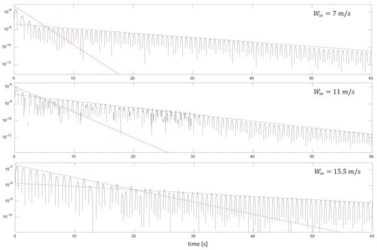 When analyzing the semi-log plots of the oscillating signals, it becomes clear that their time evolution is characterized by an exponential enveloping curve, which is manifested as a linear relation when plotted in semi-log axes. Figure 13 shows three examples of semi-log plots of the time evolution of the normalized blade deflection at selected wind speeds in different subranges of the stable regime. In all of the panels, the short-term evolution, in which the 0.87 Hz frequency dominates, shows a greater exponential decay, , given by the slope of the red line. However, the lower exponential decay associated with the 1.2 Hz frequency, , becomes dominant in the long term. In the middle panel, we can see the contribution of the 2.4 Hz frequency overlapping with the 0.87 and 1.2 Hz components. By applying a bandpass filter to each one of the dominant components, the values of their corresponding exponential decays can be measured.