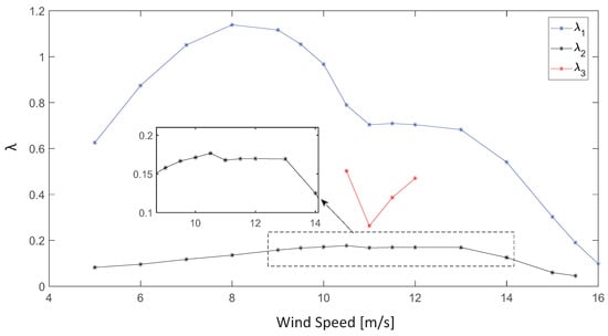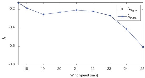 Figure 14 shows the variation of the exponential decay of the aerodynamic damping for the complete range of wind speeds in the stable oscillatory regime. The exponential decay associated with the 0.87 Hz frequency () shows a clear connection with the four different subranges associated with the frequency content that we have seen before.