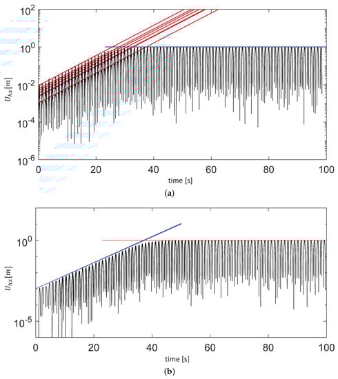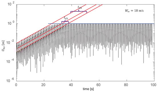 Figure 16 shows semi-log plots of the same time evolutions of the blade deflection previously shown in Figure 15. The initial expansion is exponential, which can be observed clearly in the linear shape of the initial enveloping curve in the semi-log plot. The enveloping curves of all of the pulses for the same mean wind speed show the same initial exponential coefficient , which becomes clear in the collapse of the curves for all of the pulses shown in the lower panel of Figure 16.