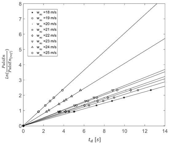 According to Equation (11), if the mechanism of energy transfer found earlier for the stable regime also holds for the unstable regime, the logarithm of the ratio between the kinetic energy of any pulse versus the energy of the reference pulse occurring at the same mean wind speed must show a linear relationship with the corresponding time delay for that same pulse, and the slope of that linear relation must be the value of at that wind speed.