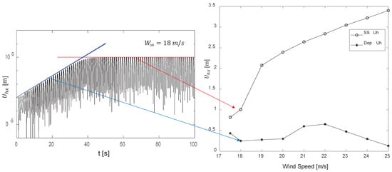 As in the stable regime, the axial displacement of the blade around the equilibrium position (depicted in the upper panel in Figure 15 for a wind-speed regime of 18 m/s) reflects the main component of the instantaneous amount of elastic energy stored in the rotor as an oscillatory system. The time evolution of the blade deflection shows the same qualitative behavior for all of the wind speeds in this regime (17.5 to 25 m/s), but with different values of the initial exponential expansion. As in the stable regime, depends exclusively on the mean wind speed.
