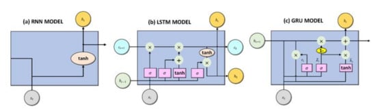The different time-sequential predictive models are utilized to validate and compare the capability and performance in predicting the generated solar power. In this study, the RNN, LSTM, and GRU are applied to explore efficiency and accuracy. In addition, the combination of bidirectional training with sequential predictive models is also utilized to evaluate the performance. The general structure of RNN, LSTM, and GRU is shown in Figure 1.