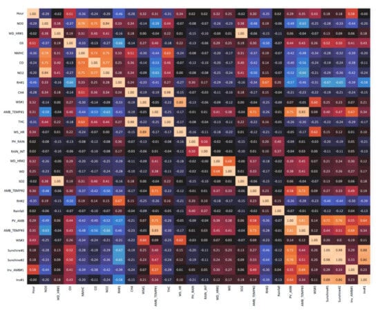 In statistics, correlation coefficients are used to measure the strength of a linear association between two variables and are denoted by r. Furthermore, the prediction dataset of solar power generation is the continuous sample data of the time series, which records the feature data per hour. This research work will use Pearson product-moment correlation coefficient to measure the linear correlation between two variables X and Y, through covariance of the two variables divided by the product of their standard deviations, and it is between +1 and −1, which is defined as follows: