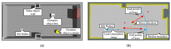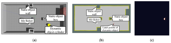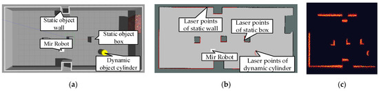 According to the grid cell coordinates S i , the corresponding occupancy probability M ( S i ) can be obtained by indexing the occupancy probability grid map calculated above. When the occupancy probability is larger than a threshold, it means that the i _ t h laser point falls on the original static object, and it does not need to be input into the particle-based PHD filter to estimate its velocity; otherwise, it needs to be input. The test environment established in Gazebo is shown in Figure 3a and the yellow area shown in Figure 3b is the inflated occupation grid map obtained by expanding on the prior grid map. After the static laser points are removed, the particles distribution estimated by filter is shown in Figure 3c.