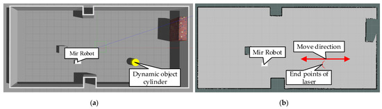 In order to improve the obstacle avoidance ability of the robot, the real-time performance of a dynamic grid map must be guaranteed. However, in the process of building a dynamic grid map with a particle-based PHD filter, it often needs a large number of particles to achieve better estimation of objects, and more particles will reduce the real-time performance of the system, which also limits the number of particles. However, there are many static objects (such as walls, tables) in the indoor navigation environment. Similar environments are established in Gazebo, as shown in Figure 2a. The white object represents the robot, the yellow object represents a moving dynamic object, and the rest are static objects. The prior map and laser measurements are shown in Figure 2b, and red indicates the laser measurements. If all the scanning points measured by the laser are input into the particle filter for estimation, the particles distribution of the filter is shown in Figure 2c. It can be found that a large number of particles are occupied on the static walls and tables for the estimation of zero velocity. In the same number of particles, this will reduce the state estimation effect of yellow dynamic objects. However, the static object information can be directly transmitted to the global planner through the static cost map during navigation, and it does not need to estimate the speed information. Therefore, in order to use as few particles as possible to estimate the dynamic object better, the input filter measurements must be preprocessed first.