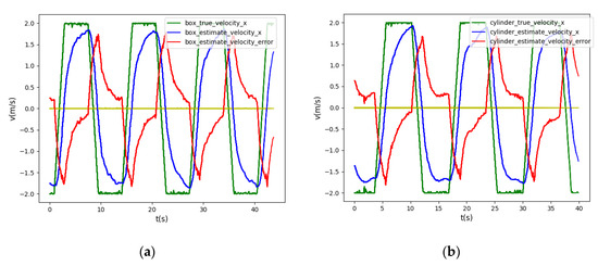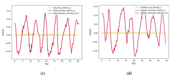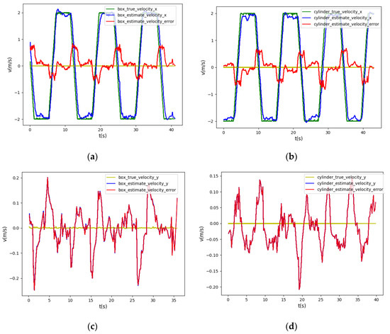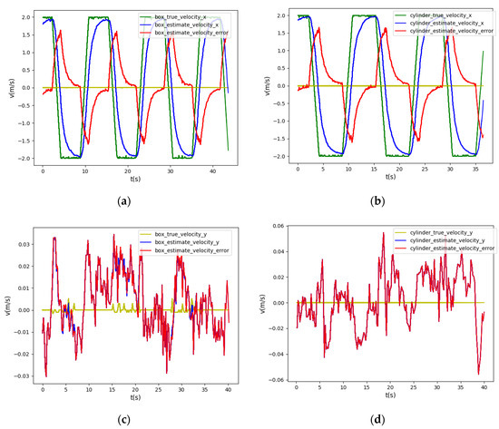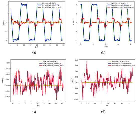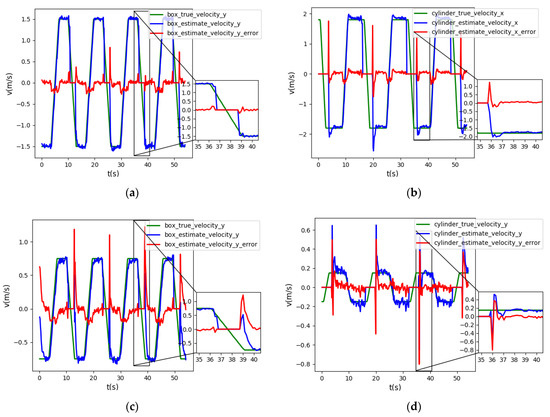 Figure 13. Comparison of filter speed estimation using the proposed motion model and true value speed when the robot is in motion. (a) Velocity comparison in the x-direction of the box; (b) Velocity comparison in the x-direction of the cylinder; (c) Velocity comparison in the y-direction of the box; (d) Velocity comparison in the y-direction of the cylinder.